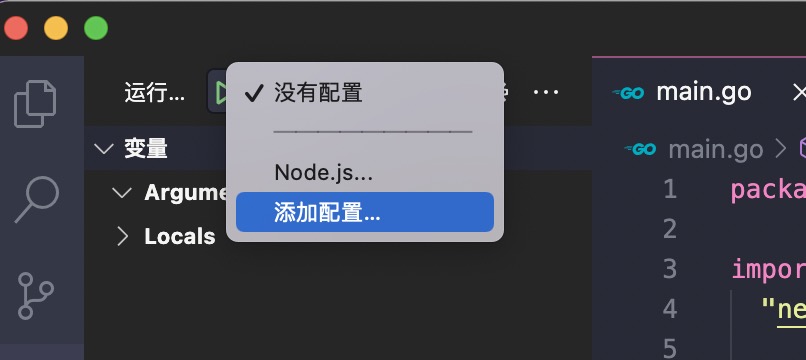 默认情况下 vs code 只能在main.go文件中调试,实际工作中很麻烦,这里需要再进一步做些配置。 点击调试,在绿色三角按钮后面下拉框中选择添加配置。